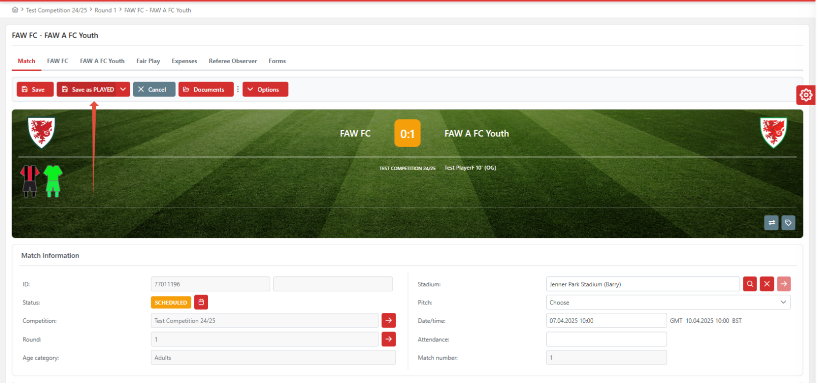 Once the match has finished and all match events have been added, the game can be moved to PLAYED status. To do this on the COMET website, simply click the 'Save as Played' button within the match, as indicated below.